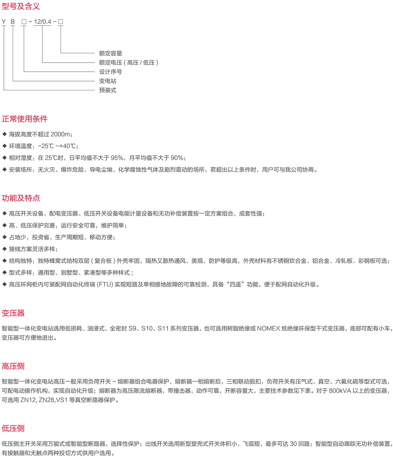 YB□-12/0.4-2500 户外预装式变电站(欧式)广泛用于城市电网改造、住宅小区、高层建筑、工矿、宾馆、商场、机场、铁路、油田、码头、高速公路以及临时性用电设施等户内外场所。