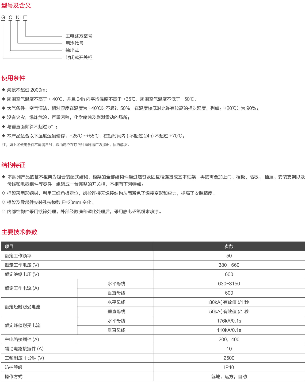 GCK低压抽出式开关柜由动力配电中心(PC)柜和电动机控制中心(MCC)二部分组成,适用于发电厂,变电站,工矿企业等电力用户作为交流 50Hz,最大工作电压至660V,最大工作电流至3150A的配电系统中,作为动力配电,电动机控制及照明等配电设备的电能转换分配控制之用。