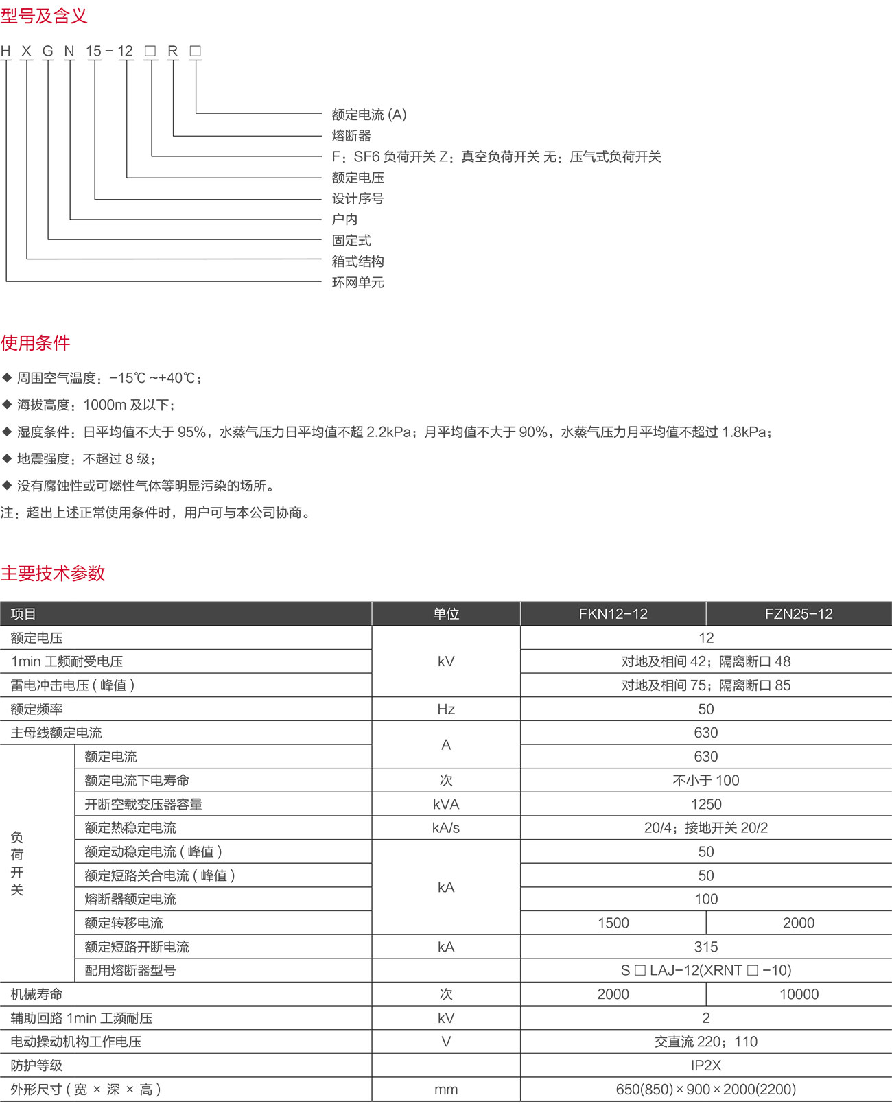 HXGN15-12交流金属环网开关设备(负荷开关)(简称环网柜),是为城市电网改造和建设需要而生产的新型高压开关设备。在供电系统中亦作为开断负荷电流和短路电流以及关合短路电流之用,本环网柜配用FZRN25、FZRN21真空负荷开关,操作机构为弹簧机构,该机构既可手动操作,也可电动操作。接地开关和隔离刀配用手动操作机构,本环网柜成套性强、体积小、无燃烧和爆炸危险,还具有可靠的”五防”功能。