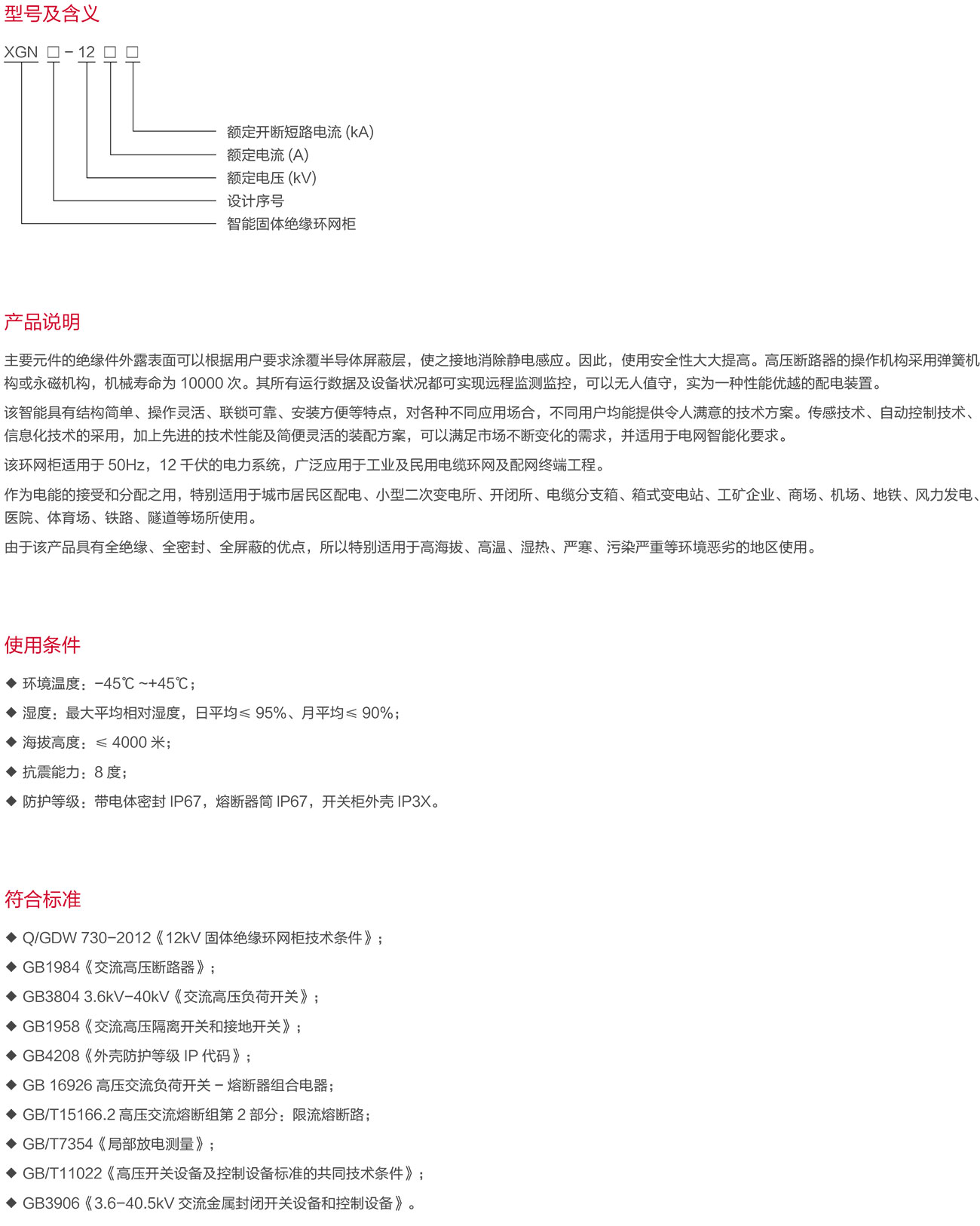 我公司自主研发了XGN□-12智能固体绝缘环网柜。XGN□-12智能固体绝缘环网柜系3.6-12kV,三相交流50Hz,单母线及单母线分段系统的成套配电装置。其开关及主要元器件为集成模块,相间导电部位间为固体绝缘封装。